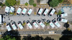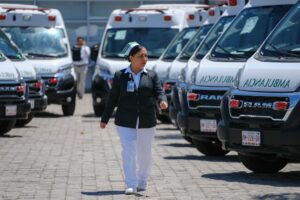 En el estacionamiento frontal de la entrada principal del Hospital General Regional No. 17 del IMSS, en Cancún, Mara Lezama, acompañada de la presidenta municipal de Benito Juárez, Ana Paty Peralta de la Peña, y del titular del Órgano de Operación Administrativa del IMSS en el estado de Quintana Roo, Javier Naranjo García, constató las condiciones de las nuevas ambulancias.