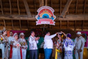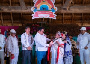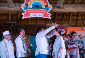 El presidente municipal José Luis Chacón y su esposa, Diana Sosa Blanco, presidenta honoraria del sistema DIF Cozumel, junto a el señor Martín Cárdenas Ávila, bastonero suplente en representación del señor Eligio Cárdenas, bastonero mayor del Cedral, Óscar Pinto Silva, presidente del comisariado ejidal “Villa Cozumel”, Javier Ovidio Vázquez López, quinto regidor y presidente de la comisión de espectáculos y diversión, Alejandro Mattar Pérez, primer regidor y secretario de la comisión de turismo y Raymundo López Martínez, oficial mayor del Ayuntamiento de Cozumel y coordinador general de las fiestas del Cedral 2025, caminaron hacia la palapa principal para llevar a cabo el protocolo de coronación de las reinas de la feria.
