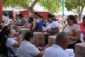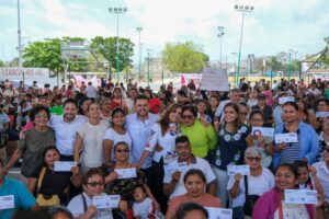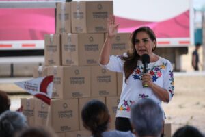 Cancún.- “Comer bien, alimentarse, es un derecho y el bienestar empieza en la cocina, en las mesas, en el plato que se sirve todos los días. No hay paz sin familias fuertes, y no puede haber un estado justo si hay niñas, niños, seres humanos que se van a dormir con el estómago vacío” expresó la gobernadora Mara Lezama Espinosa al entregar tarjetas y paquetes alimentarios del programa “Comemos Tod@s” en Benito Juárez.