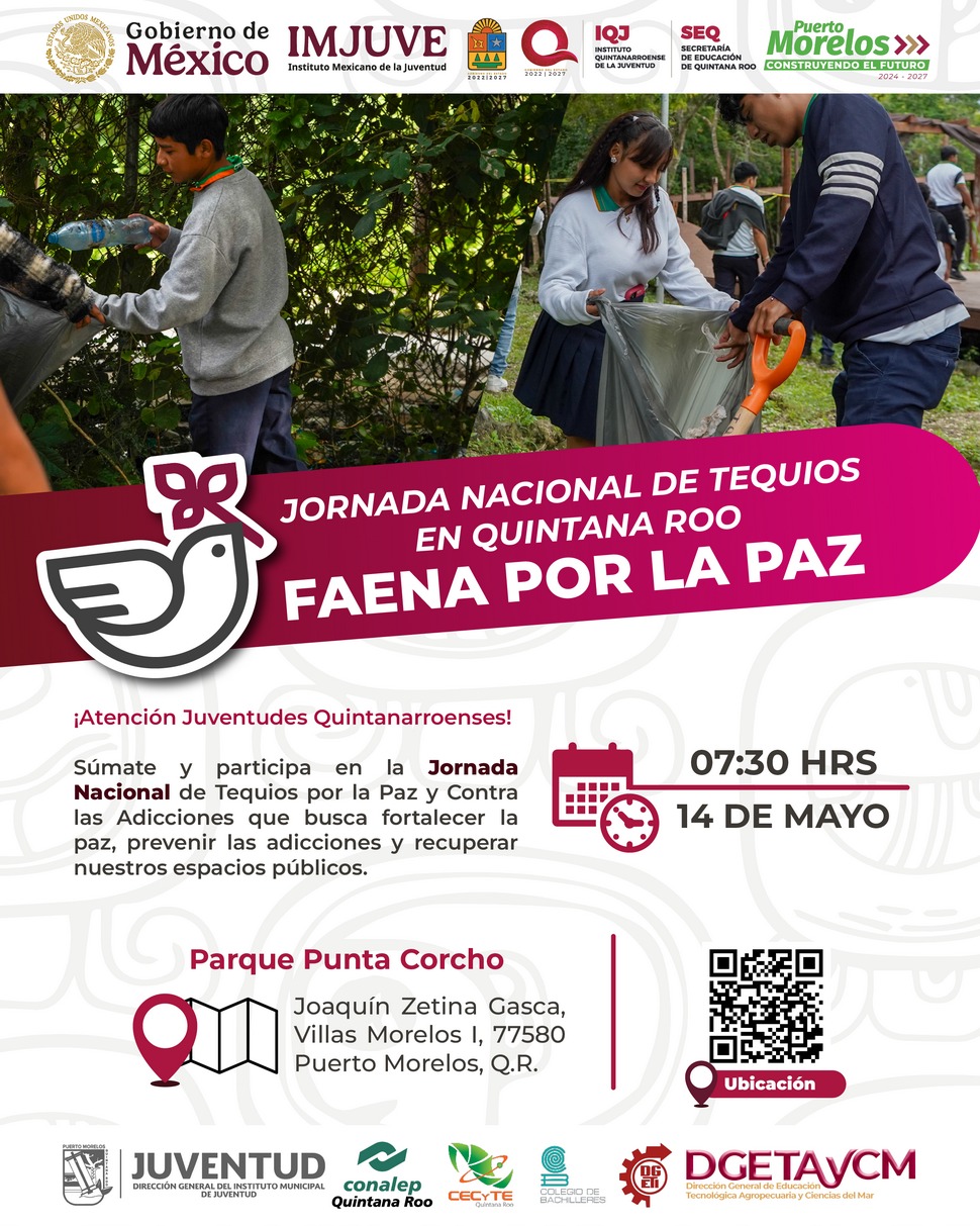 Chetumal.- En el marco de la Estrategia Nacional por la Paz y Contra las Adicciones, el Gobierno de México a través del Instituto Mexicano de la Juventud (IMJUVE) impulsa la Jornada Nacional de Tequios por la Paz y Contra las Adicciones, que se llevará a cabo de manera simultánea en las 32 entidades federativas del país este 14 de mayo, informó la directora general del Instituto Quintanarroense de la Juventud (IQJ), Alma Alvarado Moo.