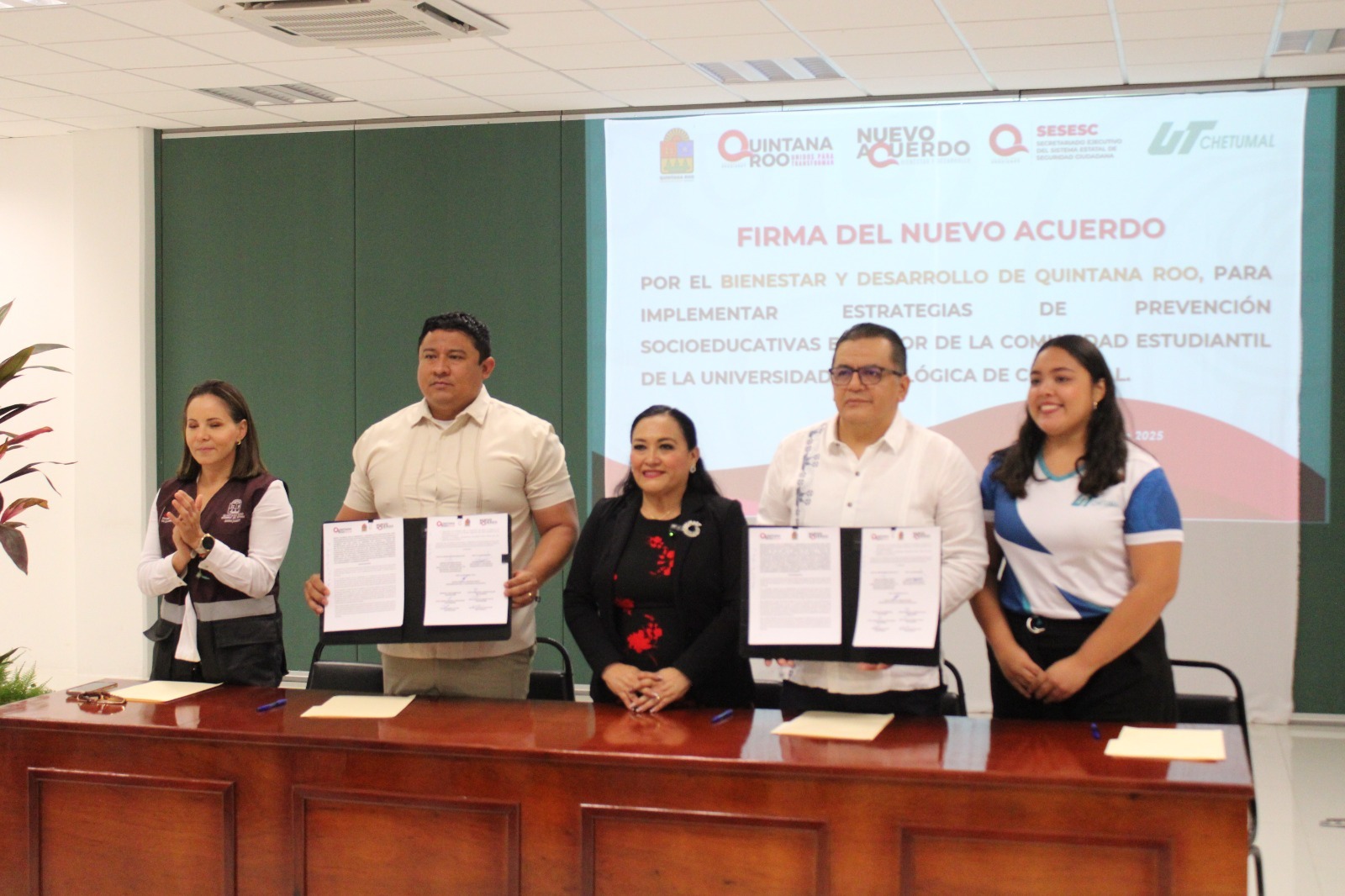 Chetumal.- Con el objetivo de implementar estrategias de prevención socioeducativas en favor de la comunidad estudiantil, el Secretariado Ejecutivo del Sistema Estatal de Seguridad Ciudadana (SESESC) y la Universidad Tecnológica (UT) de Chetumal, firmaron el Nuevo Acuerdo por el Bienestar y Desarrollo de Quintana Roo que fortalece la cultura de la prevención social del delito.
